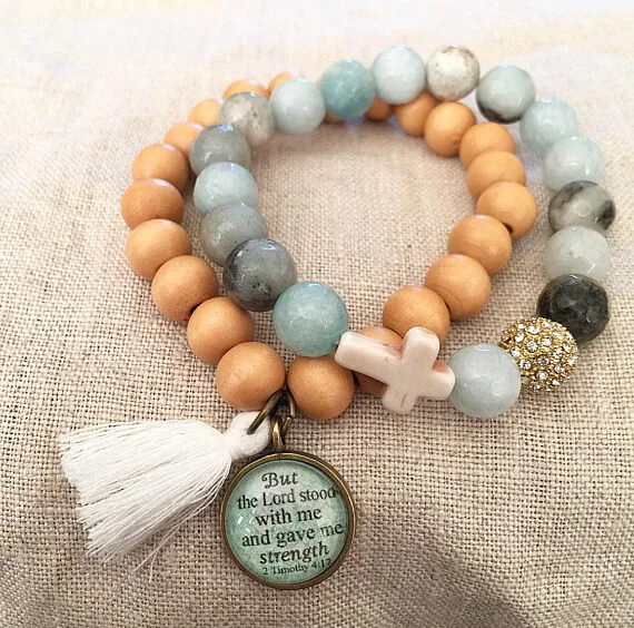 This wood and bead bracelet set by Redeemed Jewelry is inspired by 2 Timothy 4:17.