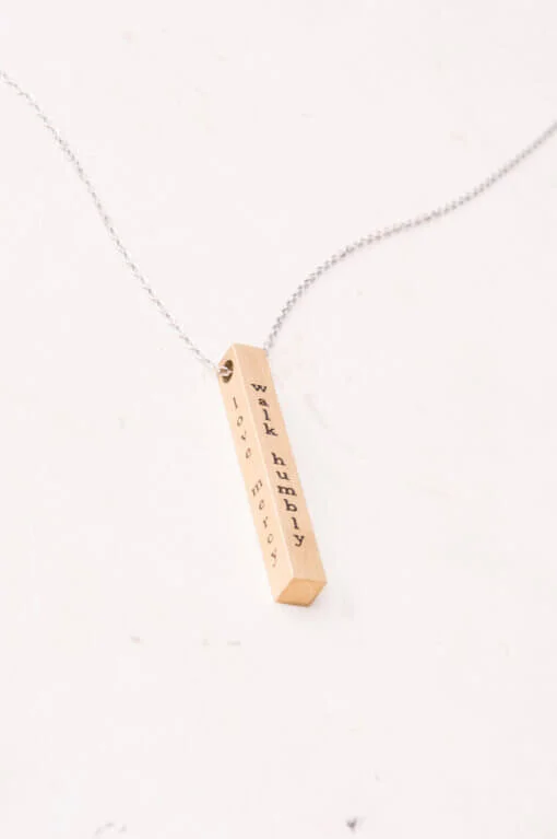 Act justly, love mercy, walk humbly gold bar necklace from the Starfish Project.