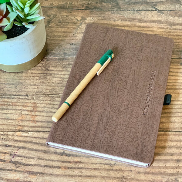 Uplift the men in your life with this special journal and pen set. Faux wood lined journal embossed with blessed+chosen and ballpoint pen. The perfect gift for men of any age and for any occasion. Birthdays, graduations, anniversaries or just because, this gift box is sure to make them feel loved by you, and blessed and chosen by God.