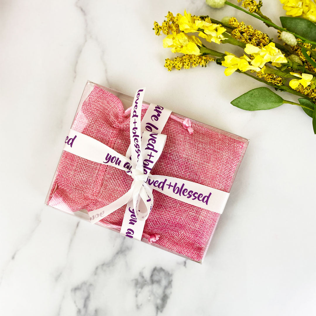Paired with a 3 John 1:2 scripture card and packaged in our pink linen pouch. You'll receive this set boxed and tied with a "You are loved+blessed" bow.