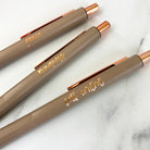 The set includes 9 ballpoint pens. Each pen has black ink and a Fruit of the Spirit printed or engraved on the side. You'll receive 3 pink pens, 3 taupe pens and 3 grey pens, all with gold toned detailing.