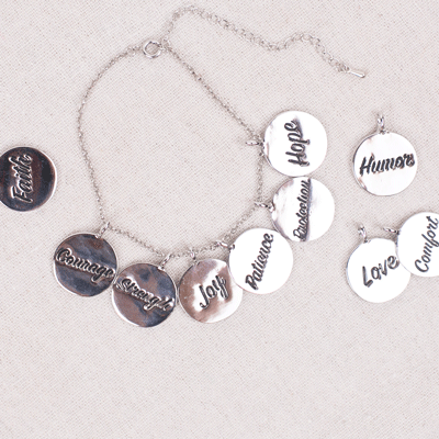 10 Charms include: Courage, Hope, Protection, Strength, Patience, Joy, Humor, Comfort, Faith, Love