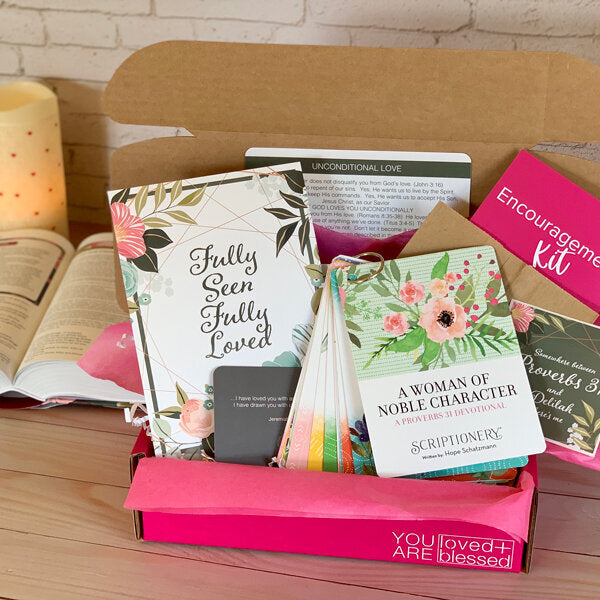 You are unconditionally loved by God, but often we read about the Proverbs 31 woman and feel intimidated by how perfect she seems. This box of encouragement will help you see that being a Proverbs 31 woman isn’t about your marital status or how many children you have, it’s about being a woman of noble character. No matter your circumstances, this care package will help you be encouraged by this passage of scripture and see yourself how God sees you. You are loved.