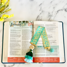 our exclusive loved+blessed® teal and gold double woven JACQUARD BOOKMARK with tassels and wooden beads
