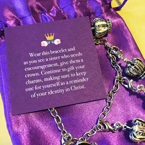 This bracelet is designed to remind you to wear your crown and hold your head high because you are a child of God, a daughter of The Most High King. Silver toned with REMOVABLE CROWNS, it’s more than a piece of jewelry, it’s a tool to help you encourage other women too.